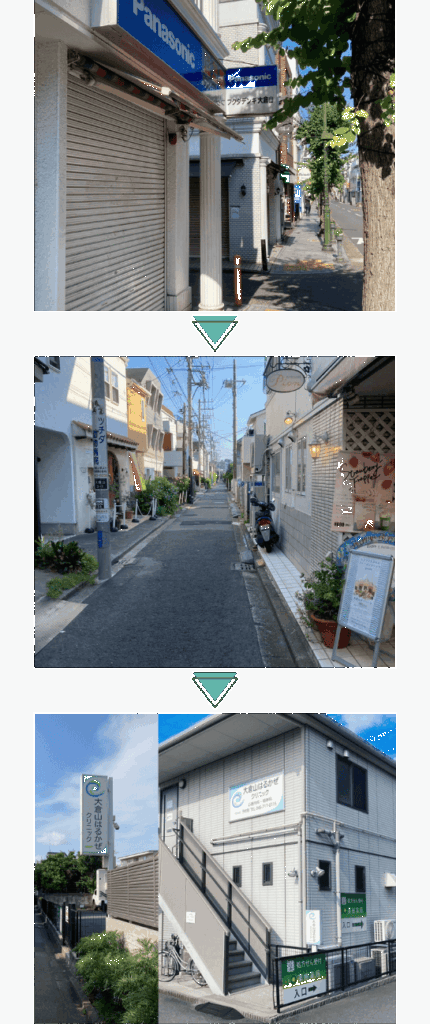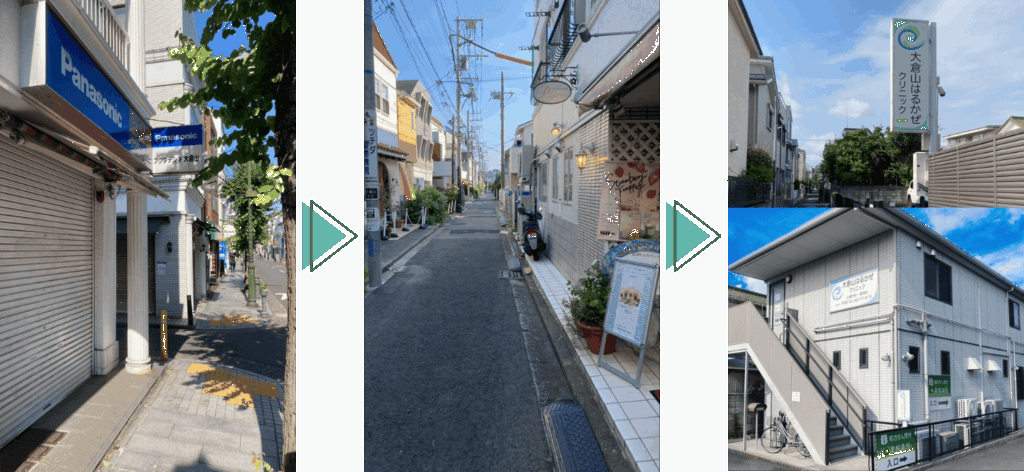 その先にあるフクダデンキ様の路地を左に曲がり、ケーキ屋さんのある通りを数分進むと、当院の看板が見えてきます。
